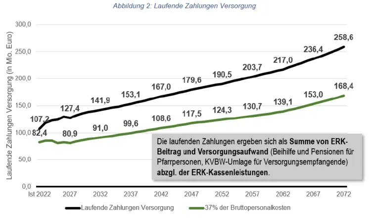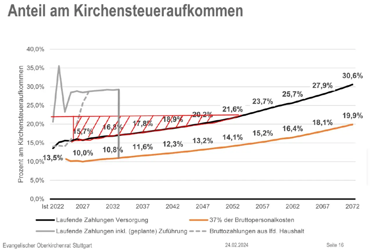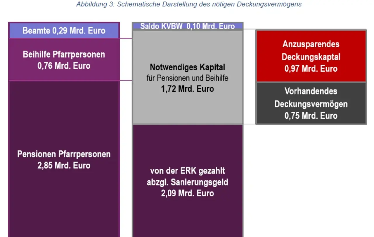 Zum Zeitpunkt des letzten versicherungsmathematischen Gutachtens (31.12.2021) hätten verbeamtete Beschäftigte in Summe Versorgungsansprüche in Höhe von 3,9 Mrd. Euro erworben. Aufwändige Berechnungen haben ergeben, dass der Landeskirche dafür rund 1 Mrd. Euro an Deckungskapital fehlt, die angespart werden müssen.