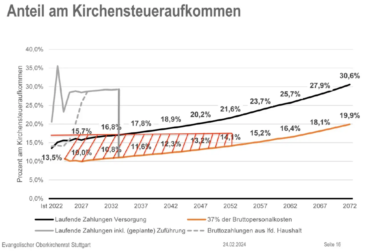 Der Oberkirchenrat habe vorgeschlagen, diese Summe auf neun Jahre (von 2025 bis 2033) zu je 103,54 Mio. Euro zu verteilen. Da zugleich die Mitgliederzahlen und die Kirchensteuereinnahmen rückläufig seien, steige dieser Betrag auf 129 Mio. Euro, um einen ausgeglichenen landeskirchlichen Haushalt sicherzustellen.