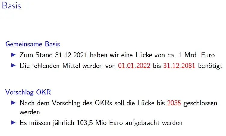 Ich kann Ihren Analysen nur uneigeschränkt zustimmen. Ja, es ist so, wir haben ein rechnerisches Defzit von etwa 1 Mrd. Euro, das wir vom 01.01.2022 bis 31.12.2081 brauchen werden. Wir übernehmen auch alle Annahmen was Kirchensteuer, die Höhe der ERK Beiträge usw. betrifft.