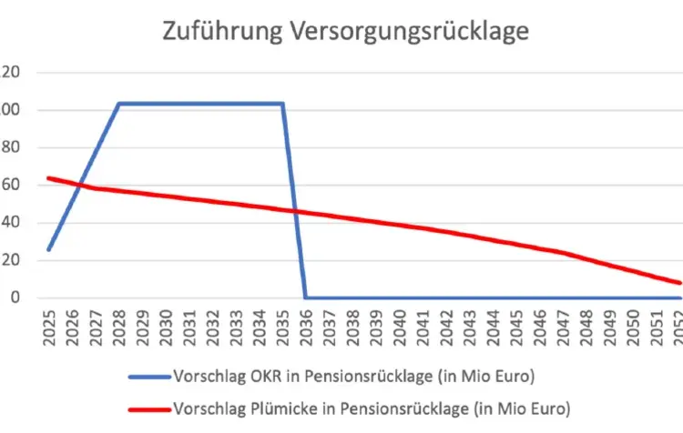 Zwischen Oberkirchenrat und dem Finanzausschuss der Landessynode seien mehrere Zeitmodelle für die Ansparung diskutiert worden: neun, zwölf, 15 und 27 Jahre. Letzterer Vorschlag war im Rahmen der Frühjahrssynode 2024 vom Synodalen Prof. Dr. Martin Plümicke eingebracht worden. Damit sinken zwar die jährlich aufzubringenden Rücklagen, zugleich aber verschiebt sich auch der Zeitpunkt der Haushaltsentlastung weiter in die Zukunft.