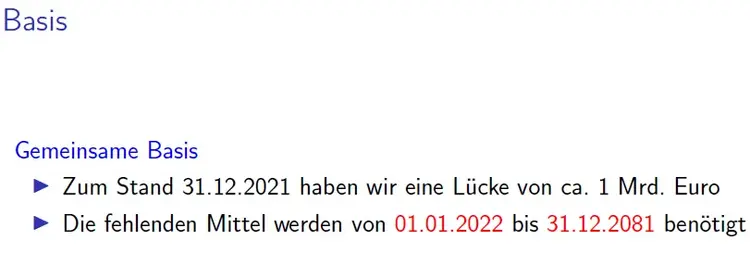 Wenn man den Ansparzeitraum auf 12 Jahre, 15 Jahre oder länger streckt, ändert das nichts am gesamten Einsparvolumen. Es bleiben 970 Mio. Deckungslücke bei der Versorgung, in jedem Rechenbeispiel. Ob wir 12, 9 oder irgendeine andere Zahl als Parameter einsetzten, die Herausforderung wird dadurch nicht kleiner.