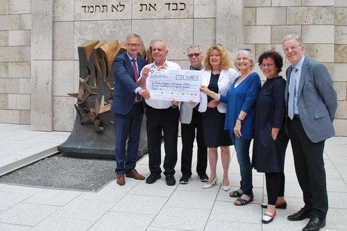 Scheckübergabe vor der Stuttgarter Synagoge (v. l. n. r. Søren Schwesig, Michael Kashi, Martin Dellit, Prof. Barbara Traub M.A., Susanne Jakubowski, Monika Renninger, Dr. Martin Schairer)