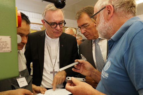 Landesbischof July und Oberkirchenrat Kaufmann zeichneten das Projekt „Lernwerkstatt Welzheimer Wald“ als vorbildliche Integrationsarbeit vor Ort aus und überbrachten einen Scheck über 2.000 Euro aus dem landeskirchlichen Fonds „Kleinprojekte mit und für Flüchtlinge“.