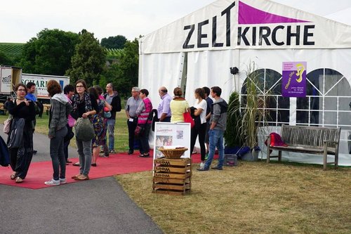 Noch bis zum 24. Juli gastiert die Zeltkirche in Lauffen am Neckar – und lockt Besucher mit ihrem bunten Programm. Eines der Highlights: eine Konzertlesung von Schauspieler Samuel Koch und Sänger und Liedermacher Samuel Harfst. Anna Gieche war dabei.