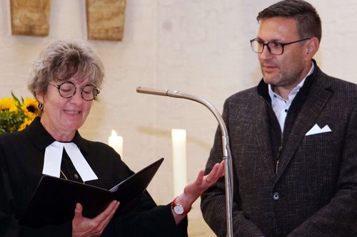 Aufmerksam lauscht der neue Geschäftsführer Manuel Schittenhelm den Worten von Prälatin Gabriele Arnold.