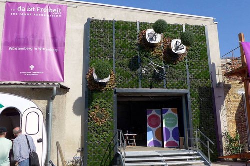 Rotierende Bäume wachsen waagrecht aus der Wand, Weinpflanzen in hängenden Flaschen: Die Württemberger Halle zum Reformationsjubiläum in Wittenberg bietet einige Hingucker. Am 21. Mai wurde die Präsenz der Evangelischen Landeskirche bei der Weltausstellung offiziell eröffnet.