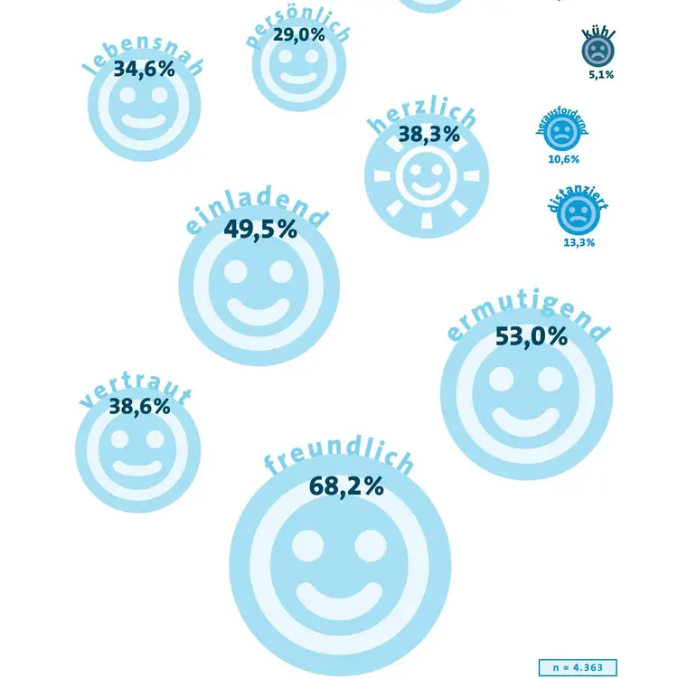 Die meisten Teilnehmenden (60,5%) schauen die digitalen Gottesdienste allein. Insgesamt fühlten sich die meisten im Online-Gottesdienst wohl: Viele beschreiben die Atmosphäre vor allem als freundlich, ermutigend, einladend, herzlich und lebensnah. Nur sehr wenige erlebten eine distanzierte oder gar kühle Atmosphäre. Als Hauptinformationsquelle gab ein Drittel der Befragten das Pfarramt der eigenen Gemeinde an, gefolgt von Social Media (17%).