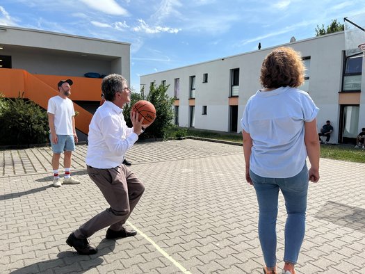 Zuvor hatten die beiden Vertreter der Kirchen in Württemberg, Ernst-Wilhelm Gohl, Landesbischof der Evangelischen Landeskirche in Württemberg, und Thomas Maria Renz, Weihbischof der Diözese Rottenburg-Stuttgart, eine Einrichtung in Stuttgart-Möhringen besucht, um die haupt- und ehrenamtliche Arbeit des Projekts „ZIFA-jobcoaching“ des Caritasverbandes für Stuttgart e.V. sichtbar zu machen und mit den Geflüchteten, die in der Initiative begleitet werden, direkt ins Gespräch zu kommen. Höhepunkt war ein gemeinsames Basketballspiel.
