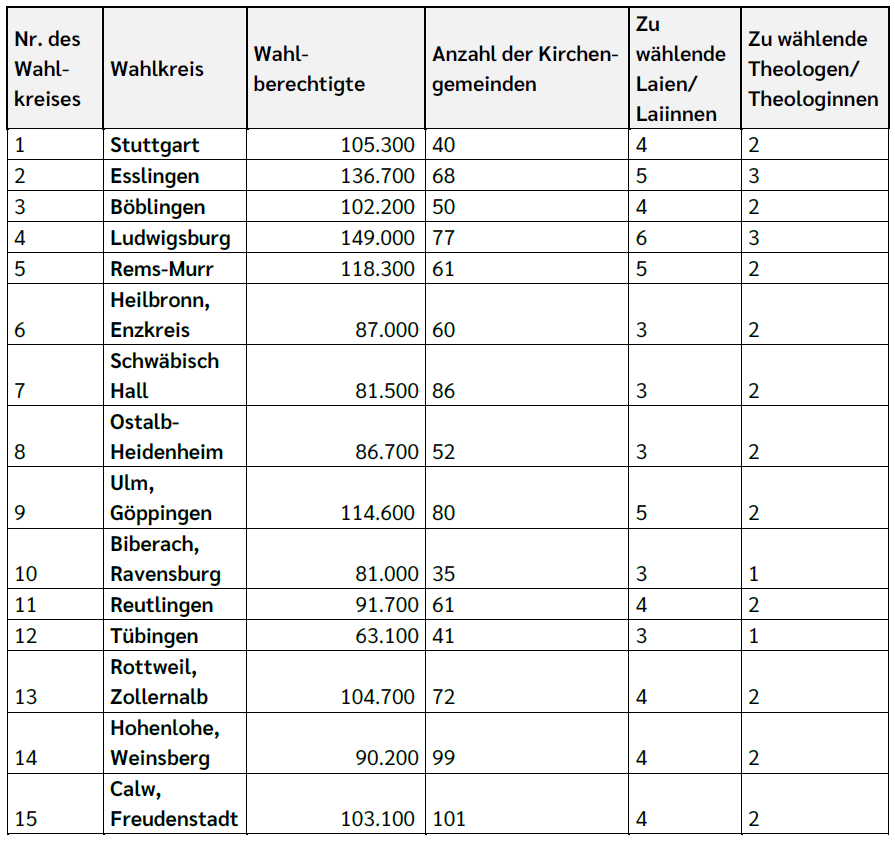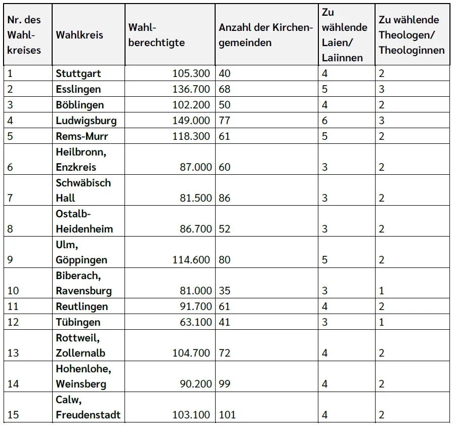 Im Folgenden finden Sie für die 15 Wahlkreise die Zahl der Wahlberechtigten und die Zahl der Kirchengemeinden: