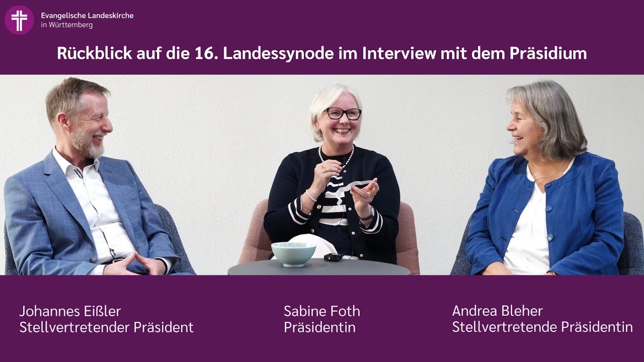 Sechs Jahre lang haben Synodalpräsidentin Sabine Foth, die erste stellvertretende Präsidentin Andrea Bleher und der zweite stellvertretende Präsident Johannes Eißler als Präsidium die Leitung der Sitzungen und die Geschäftsführung der 16. Landessynode verantwortet. Im Interview blicken Sie zurück auf die Startbedingungen unter Corona, auf schwere Entscheidungen und auf kraftspendende Momente – und verraten, was Sie dem künftigen Präsidium raten würden.
