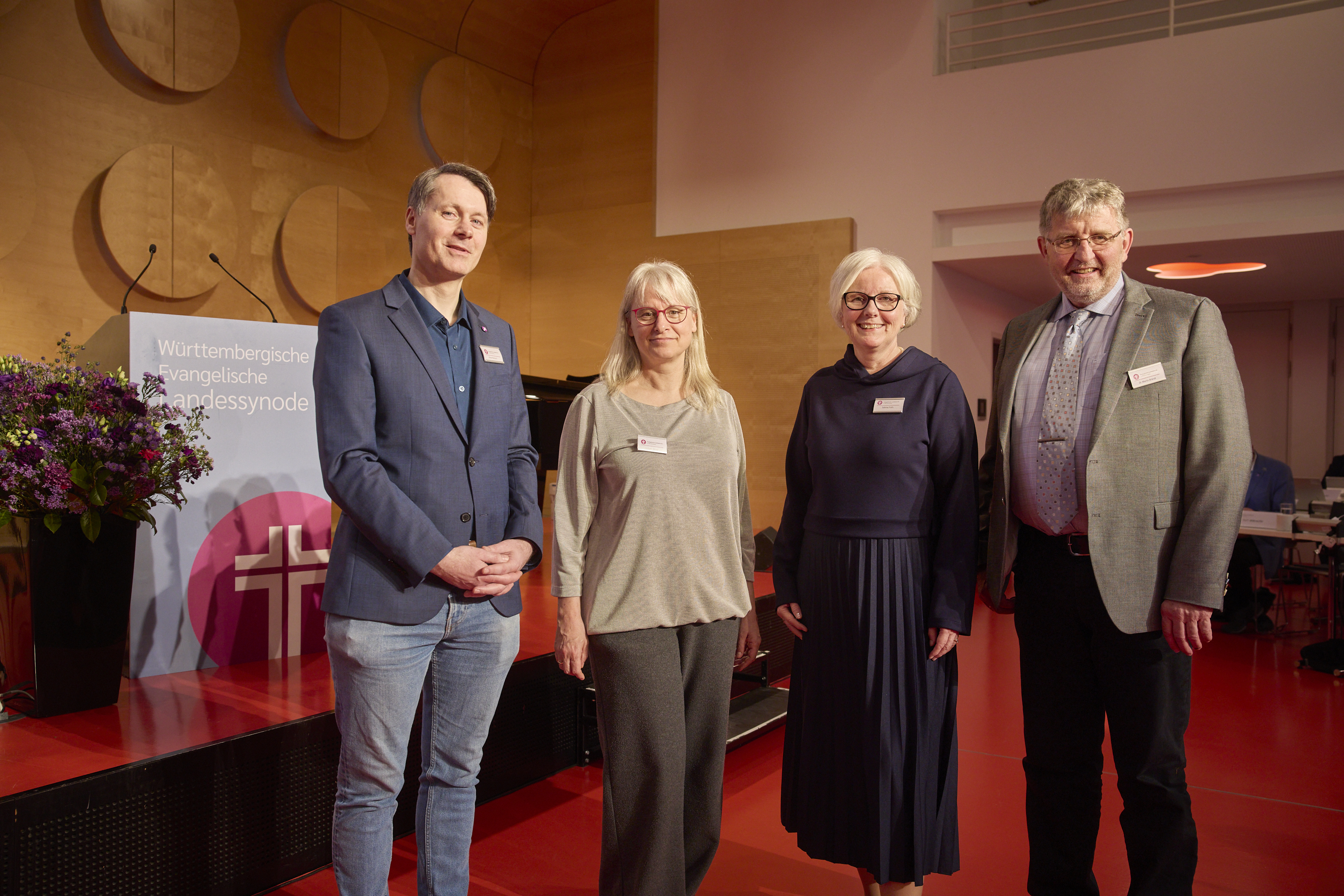 Das gewählte Präsidium vlnr Oliver Römisch, Lisbeth Sinner, Synodalpräsidentin Sabine Foth, Dr. Martin Brändl (JPG)