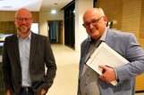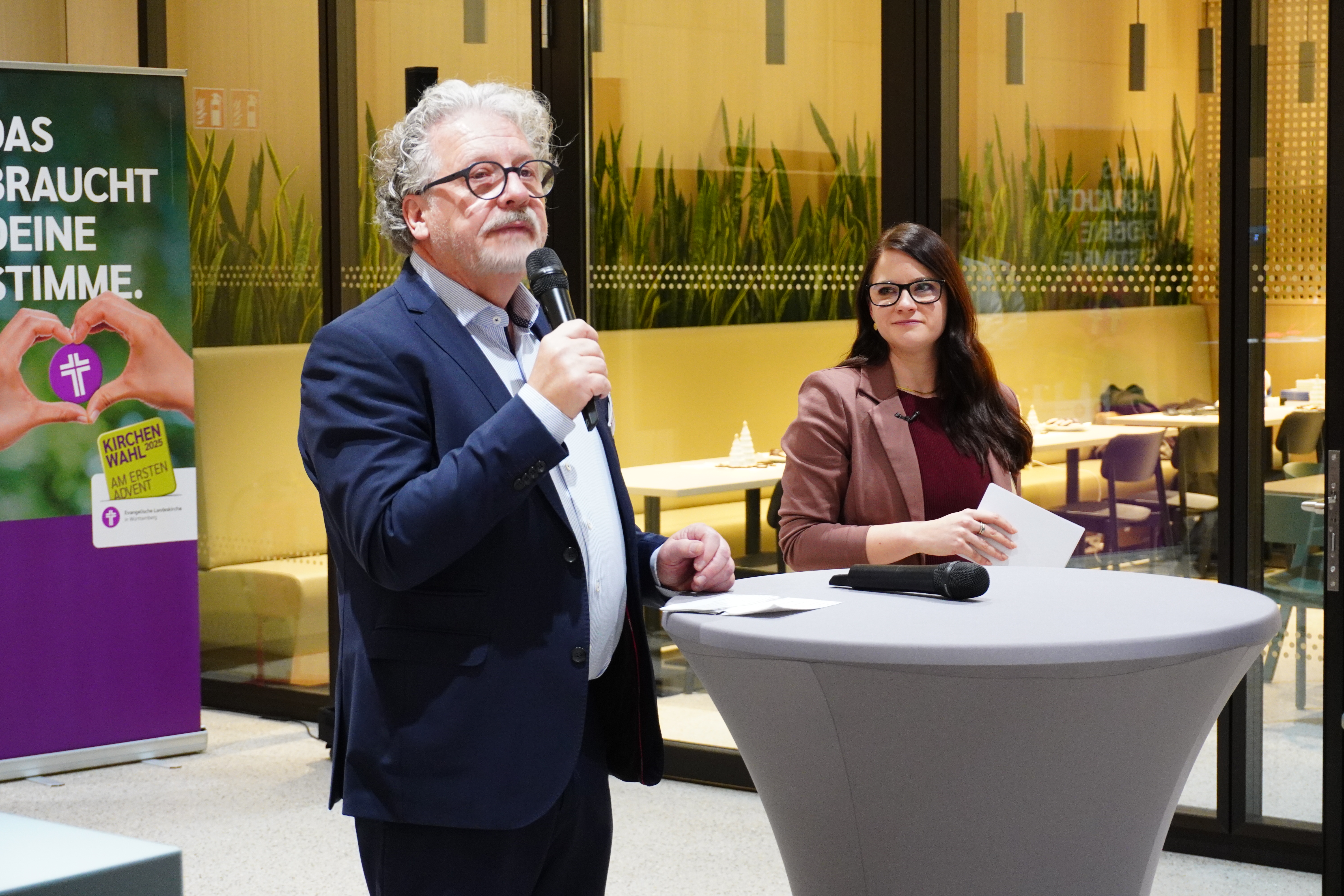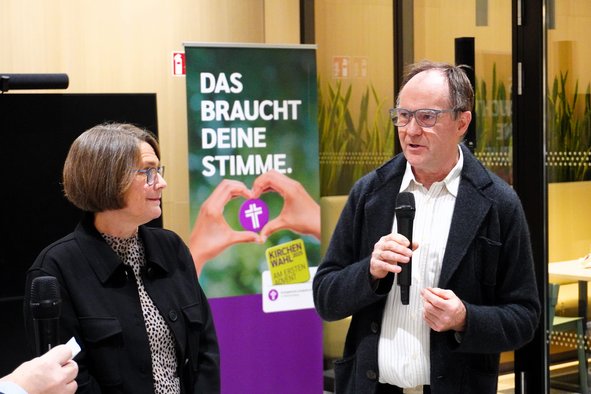 20:30 Uhr: Der Wahlabend im Oberkirchenrat beginnt. Dan Peter, Sprecher der Landeskirche, und Nadja Golitschek, Stellvertretende Sprecherin der Landeskirche, führen gemeinsam durch den Wahlabend.